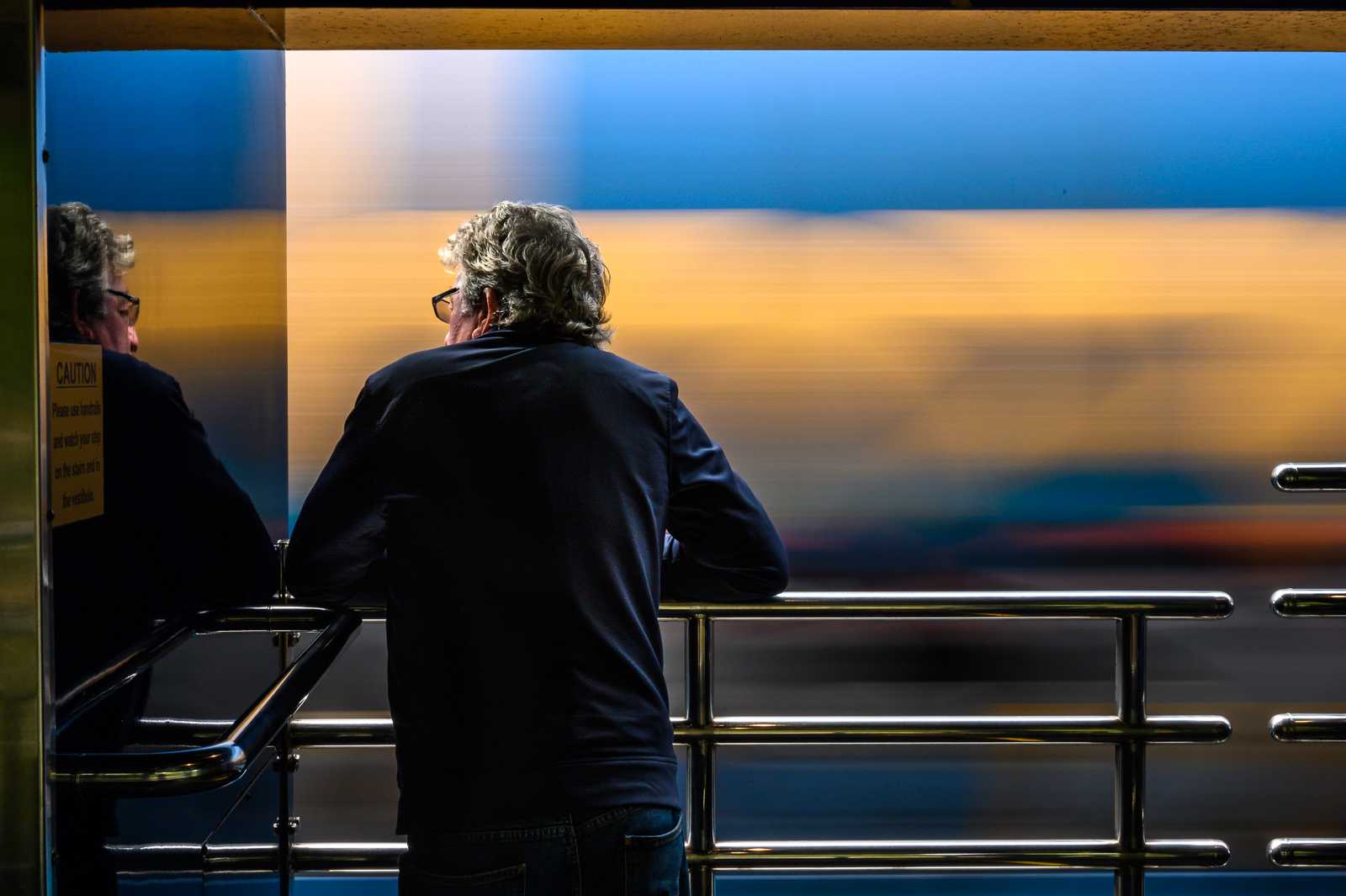 A feeling of life rushing by came over me as I spotted a fellow passenger enjoying the outside observation platform aboard the Rocky Mountaineer train. A freight train rushed by blurring the background while the man looked on. He seemed to be looking back at his reflection to where he has been as life rushed by. It reminded me of how quickly life seems to pass us by. I need to spend more time enjoying the moment.