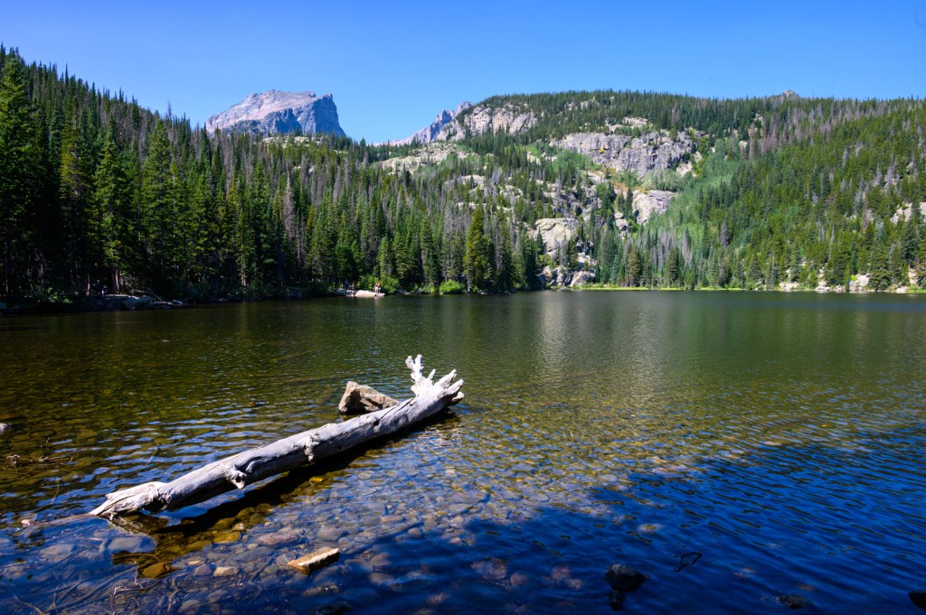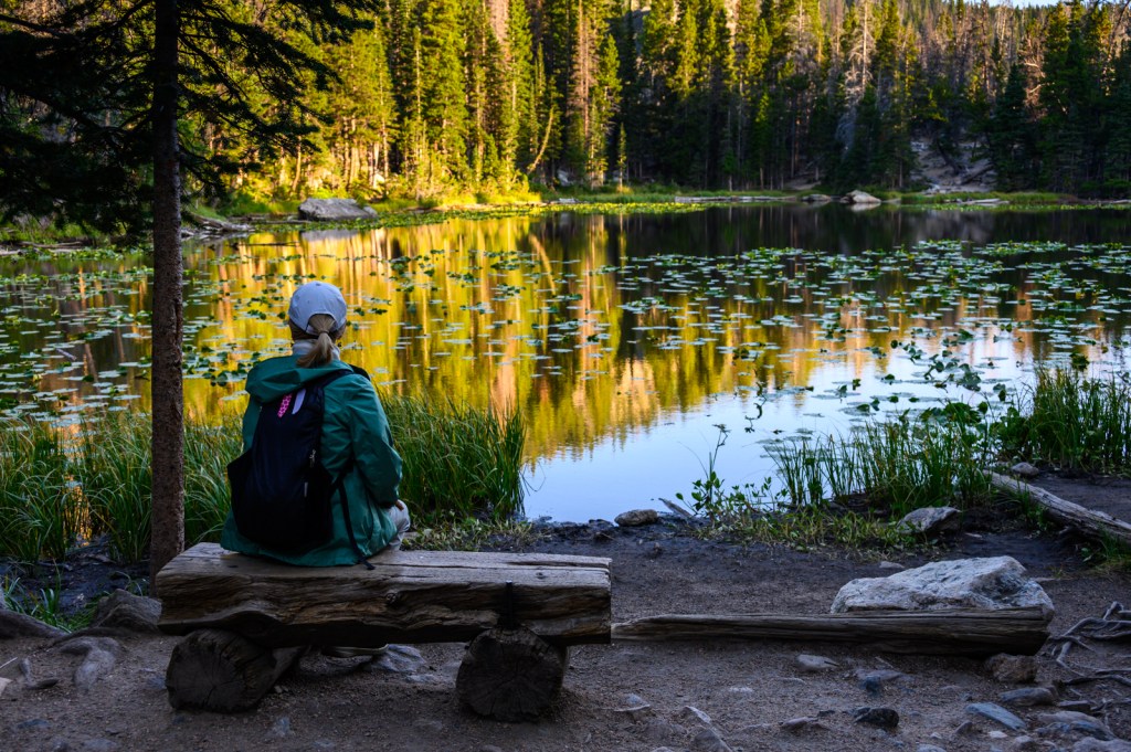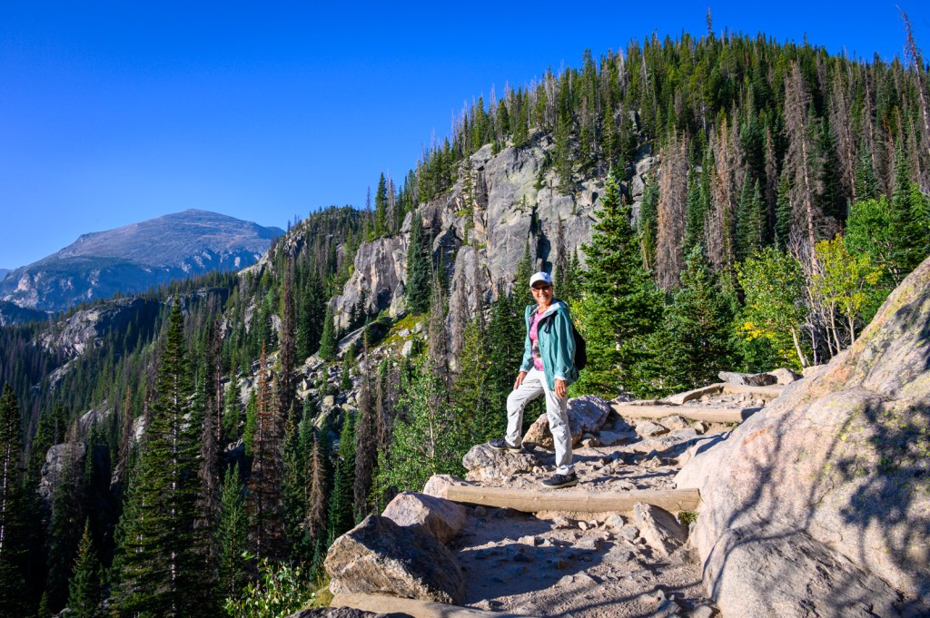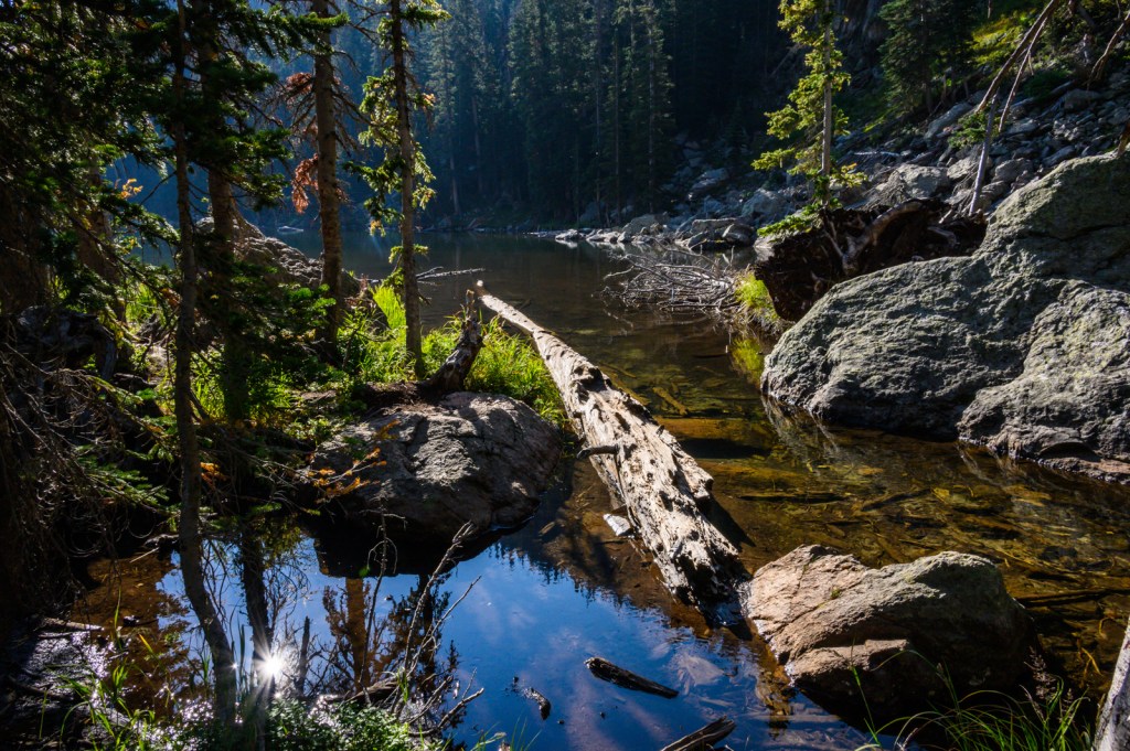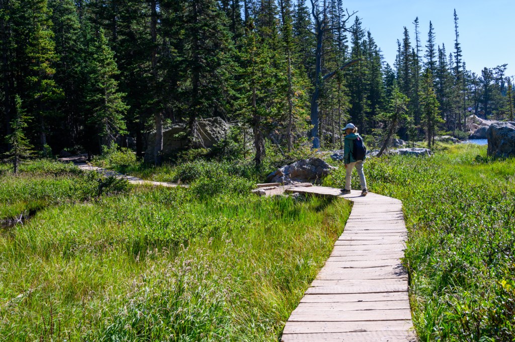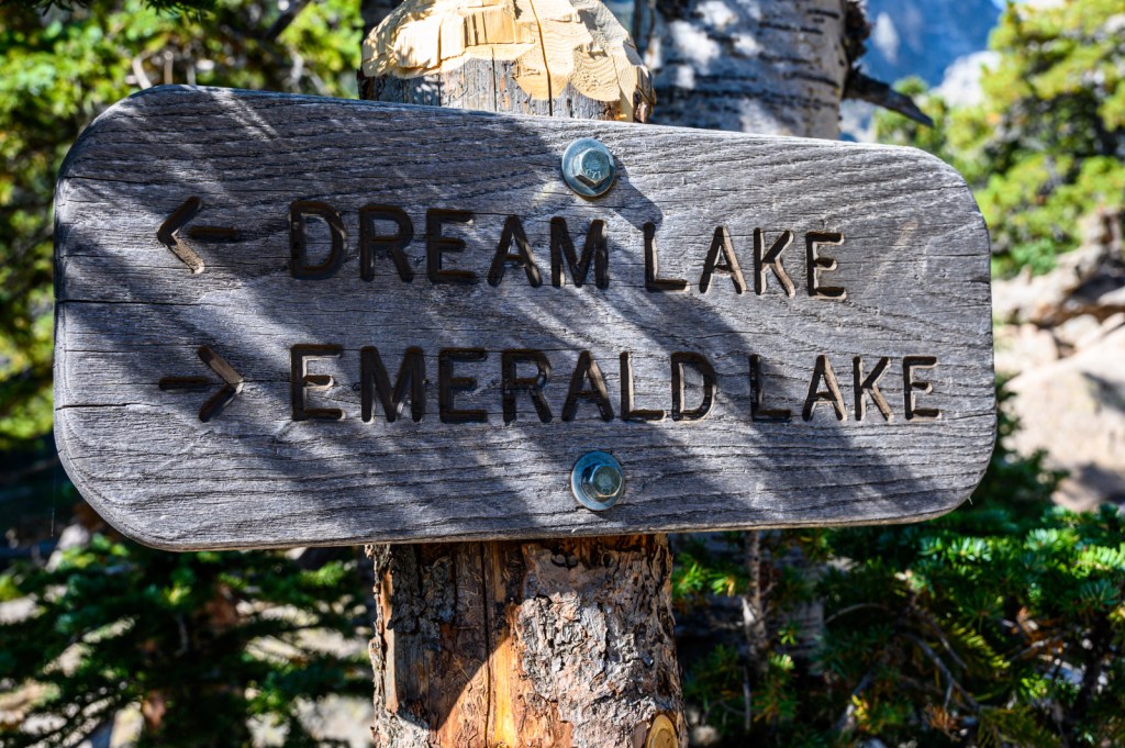 We were in luck! We parked the car in one of the few remaining parking spots and headed to the Bear Lake Trailhead. The night before, we decided we would hike to Emerald Lake, a 1.8 mi hike passing two other lakes on the way… Nymph Lake and Dream Lake. The 605 ft elevation gain seemed to be a good way to get our hiking legs in a little shape before hiking trails with greater elevation challenges. Our early start allowed us to enjoy the uncrowded forest trails and lake views. Of course, we captured many photos of the picturesque sights along the way.
