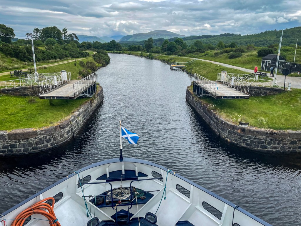 After a pleasant night in Oban, the Lord of the Glens sailed to Corpach, the gateway to Scotland’s Caledonian Canal. The Corpach lock is the western entrance to the Caledonian Canal built between 1803 and 1822 to connect the natural Lochs (Lakes) that lie along the slip fault of the so-called Great Glen.