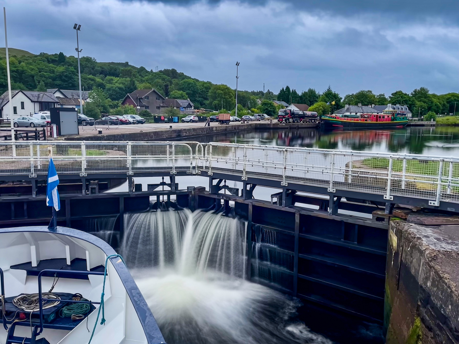 Thanks for taking us on your Scottish locks cruise. Good photos with good narrative, as always. I especially liked your video of going through the locks. I kept seeing you move from lock to lock along what seemed like the same water level and couldn’t understand what was happening. It took me a while before I saw from watching the buildings along the canal to realize that you were going down as the water in the lock ahead was rising. It was a nice, pretty, informative trip. (I’ve been through many locks, aboard a submarine when I was in the Navy and on my sailboat coming down from NY, so I especially liked your canal tour.